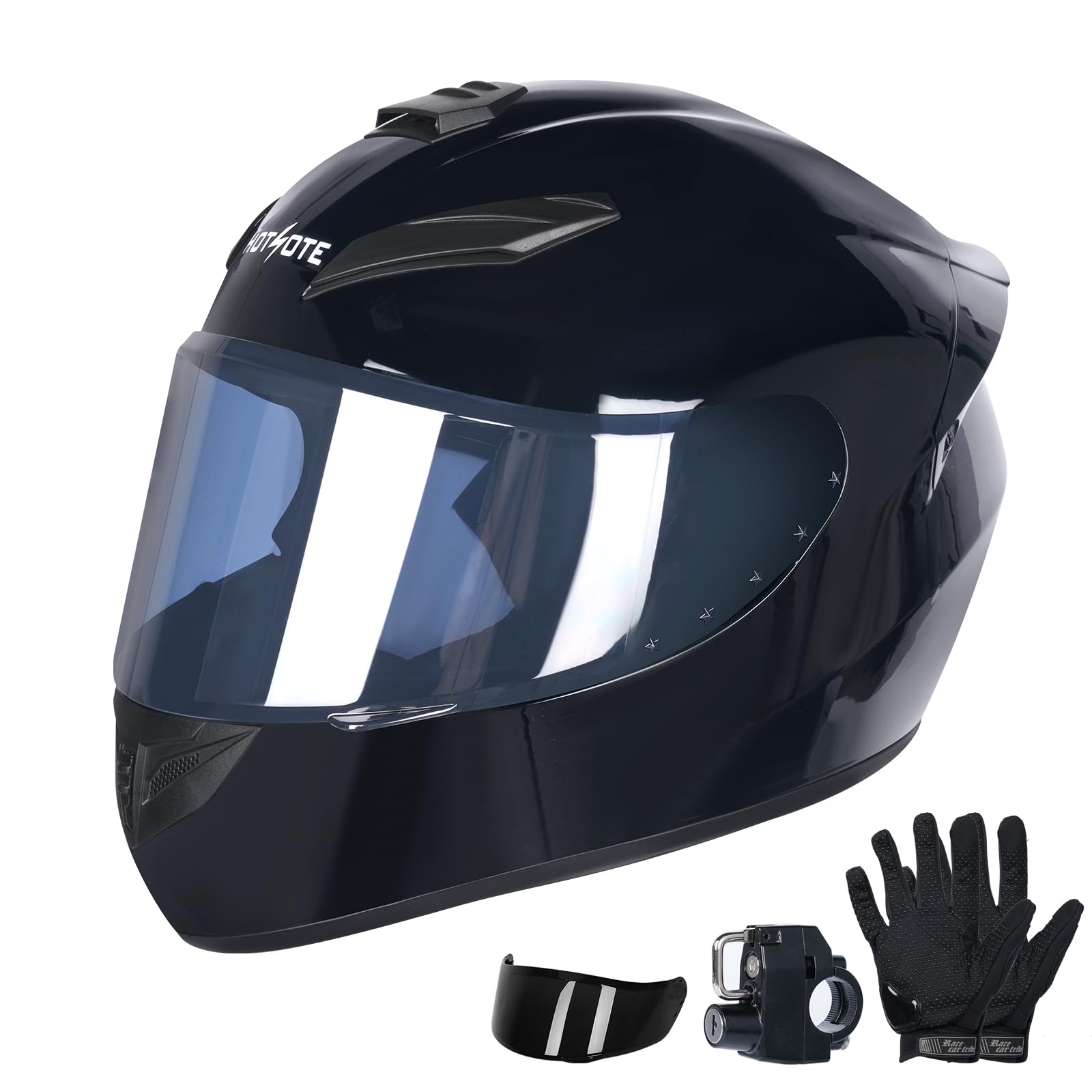 If you’re looking for an affordable helmet that comes with a few extras, the Full Face Motorcycle Street Bike Helmet with Motorcycle Gloves for Men and Women + 2 Visors DOT Model and Helmet Lock for BMX ATV MTB Riding, Road Racing, Cycling Bright Black Large by HOTNOTE is a decent choice.